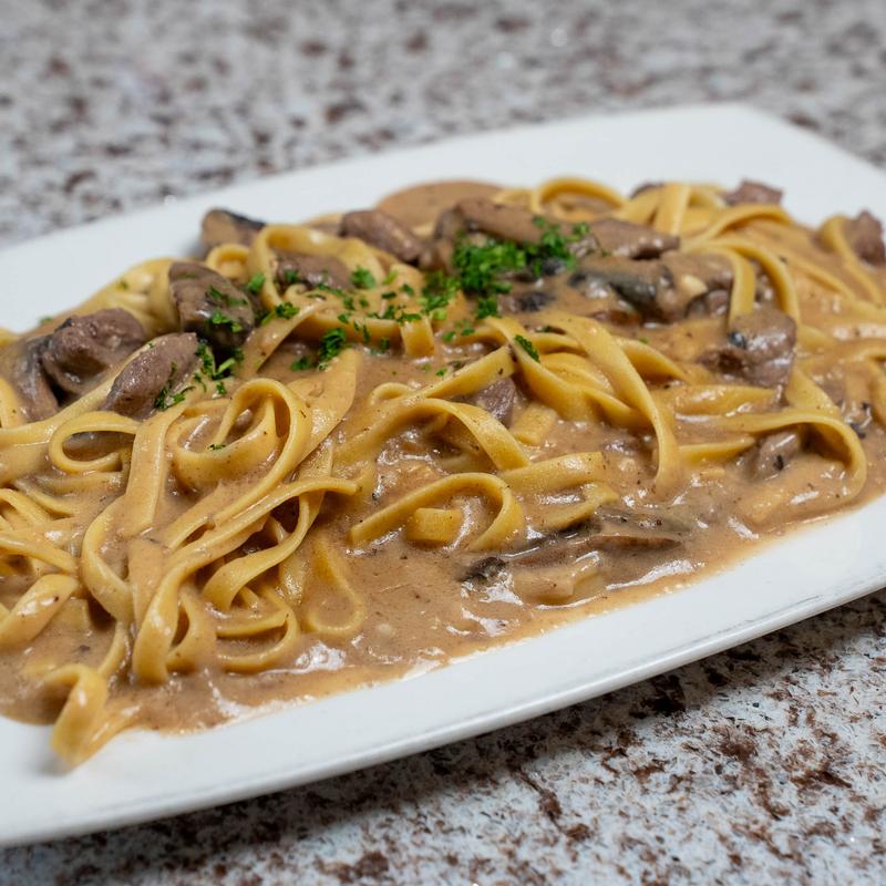 Choice sirloin strips served over fettuccine with sautéed mushrooms and Stroganoff sauce • Small Plate $19.95 | Large Plate $24.95
