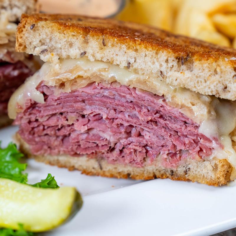 Half-pound of deli sliced corned beef, topped with sauerkraut and Swiss on toasted rye
