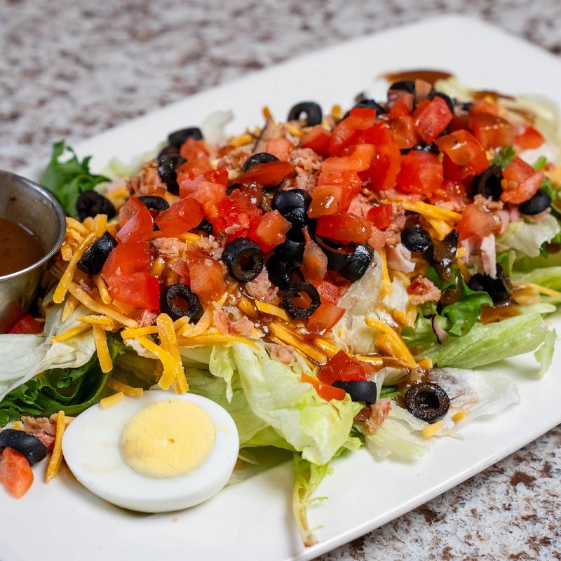 Mixed greens topped with diced turkey breast, ham, bacon, chopped egg, diced tomatoes, olives, and shredded Cheddar. Served with a side of balsamic vinaigrette dressing