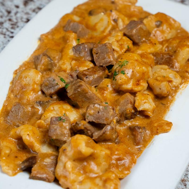 Tender chunks of beef served over dumplings, topped with a paprika-seasoned brown gravy • Small Plate $17.95 | Large Plate $22.95