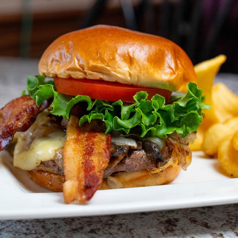 Half-pound beef patty, grilled mushrooms & onions, and Monterey Jack on a brioche bun