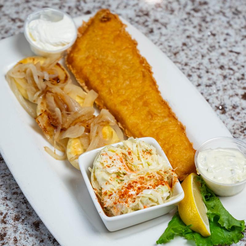 9oz pollock coated in a crispy Budweiser batter and fried golden. Accompanied by three savory pierogies, topped with grilled onions. Served with sour cream and coleslaw